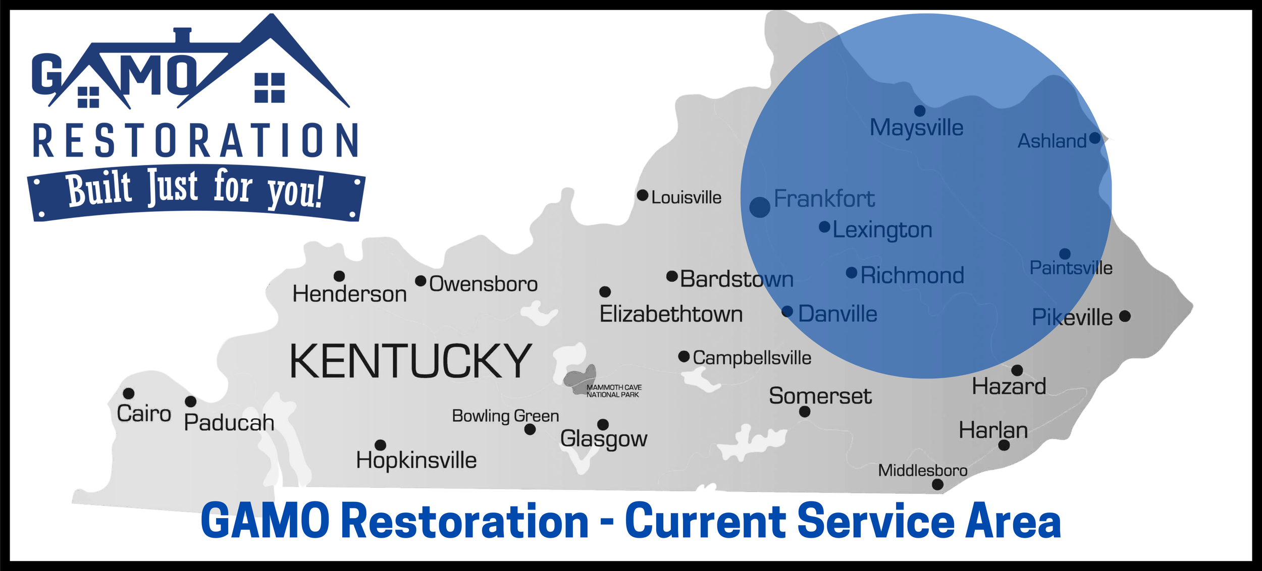 Group of six people wearing blue and white shirts with a company logo, standing in front of a sign that reads "GAMO RESTORATION Built Just for You!"